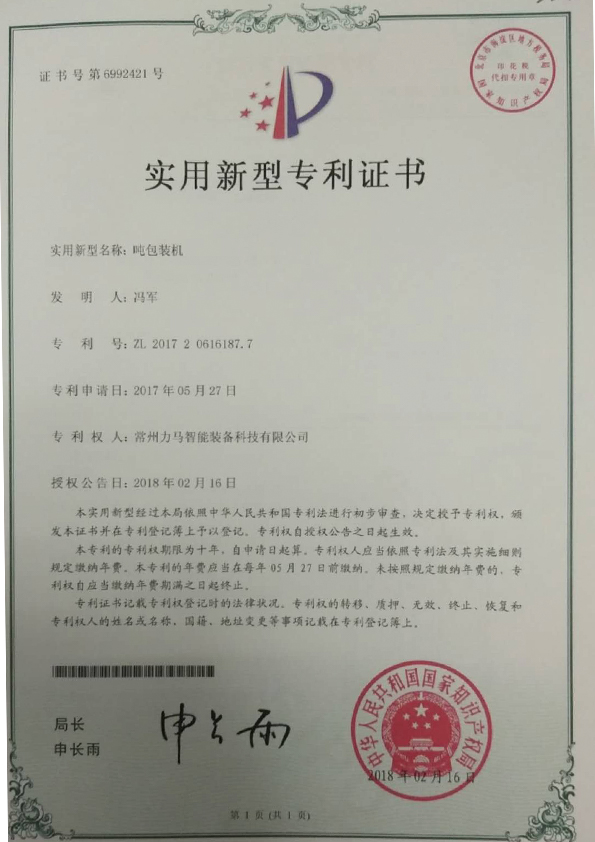 專利證書-噸袋包裝機