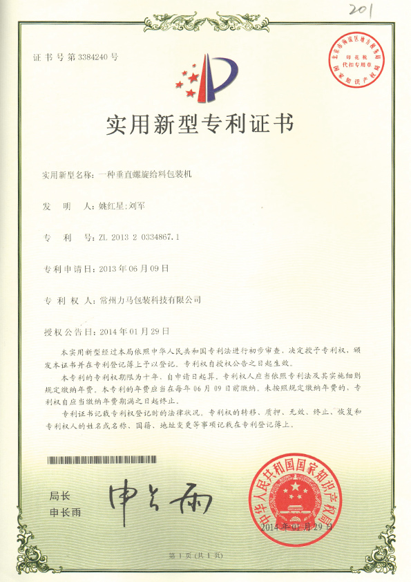 垂直螺旋包裝機專利證書