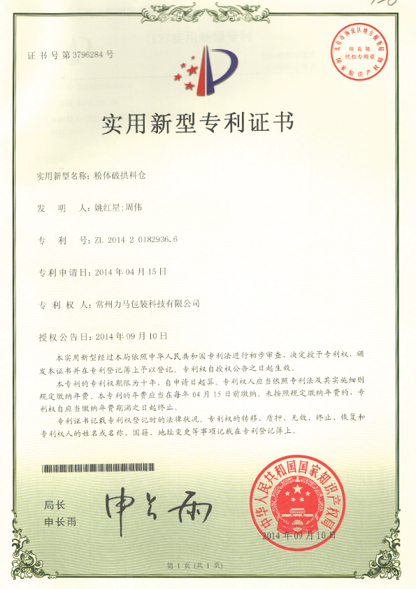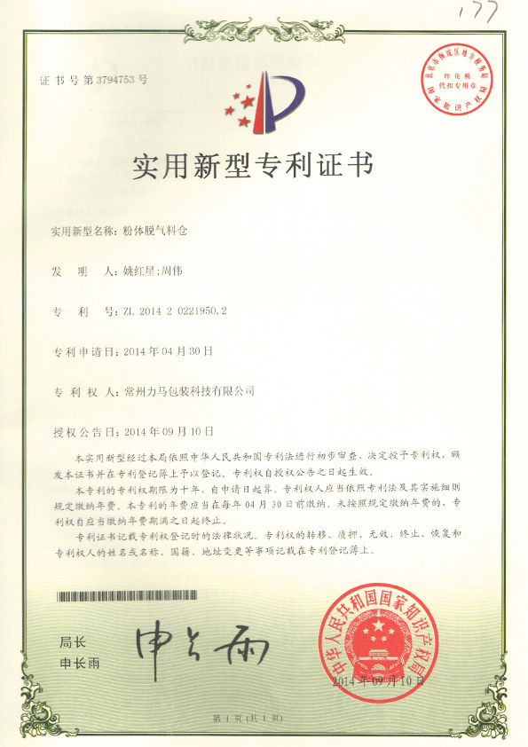粉體脫氣料倉專利證書